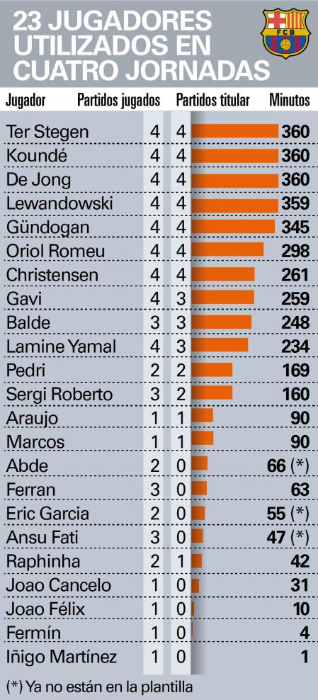 ლა ლიგის მიმდინარე სეზონში "ბარსელონას" სულ სამი ფეხბურთელი ჰყავს ისეთი, რომლებსაც ყველა შესაძლო წუთი აქვთ ნათამაშები: