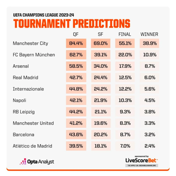 Opta-ს სუპერკომპიუტერი "ბლაუგრანას" ტურნირის მოგების 3.2%-იან შანსს აძლევს.