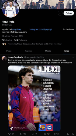 "ლოს ანჯელეს გელექსის" ესპანელმა ნახევარმცველმა, რიკი პუჩმა ტვიტერზე მოიწონა პოსტი, სადაც "ბარსელონას" მთავარი მწვრთნელი, ჩავი ერნანდესია გაკრიტიკებული.