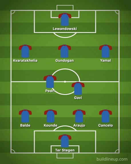 ტერ შტეგენი - ბალდე, კუნდე, არაუხო, კანსელუ - პედრი, გავი, გიუნდოგანი - კვარაცხელია, ლევანდოვსკი, იამალი