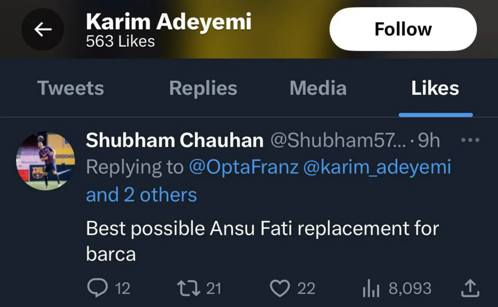 დორტმუნდის "ბორუსიას" თავდამსმხელმა კარიმ ადეიემიმ "ბარსელონას" გულშემატკივრის ტვიტი მოიწონა.